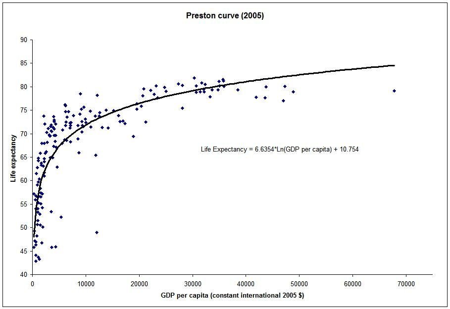 First, regarding the argument about diminishing marginal utility, while income does predict greater well-being, it only does so to a substantial degree up to a point. Past a GDP per capita of around $20,000-$30,000 a year, countries with higher income have essentially no difference in life expectancy, a relationship referred to as the “Preston Curve”: